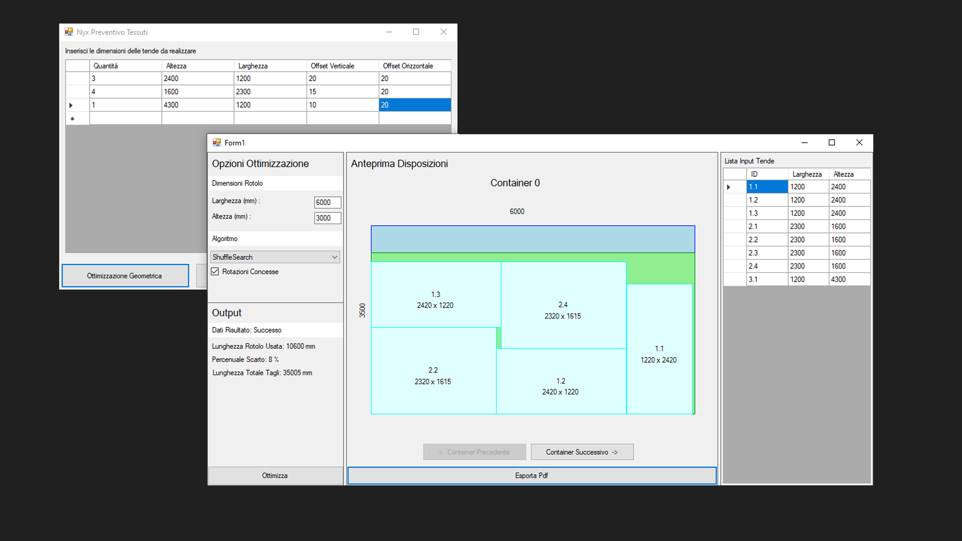 Inoltre, permette di esportare un report PDF sulla lavorazione da effettuare, con uno schema grafico e la lista di taglio.