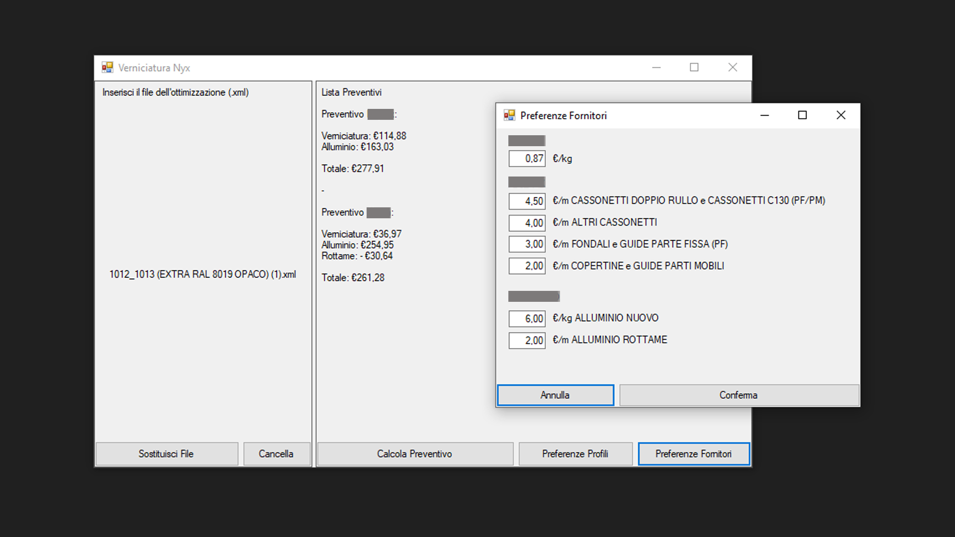 Permette di configurare il costo di verniciatura al metro lineare o a barra di più fornitori, e calcola la scelta per minimizzare il costo.